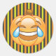 A laughing pumpkin emoji on a green, black, and orange striped sticker, perfect for Halloween.