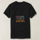 The "Laughs in Large Amounts" t-shirt design features a bold, multicolored typography that immediately draws the eye. The letters are set against a backdrop of playful patterns and symbols representing laughter and joy, creating a vibrant and energetic composition. The overall aesthetic is cheerful and uplifting, perfect for those who appreciate a good sense of humour