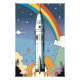 A sleek space rocket blasts off, its trail of fire and smoke rendered in vibrant rainbow retro artwork, creating a striking fusion of futuristic propulsion and nostalgic colour. The dynamic hues streak across the sky, evoking a sense of wonder and excitement as the rocket ascends into the cosmos.