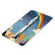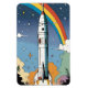 A sleek space rocket blasts off, its trail of fire and smoke rendered in vibrant rainbow retro artwork, creating a striking fusion of futuristic propulsion and nostalgic colour. The dynamic hues streak across the sky, evoking a sense of wonder and excitement as the rocket ascends into the cosmos.