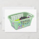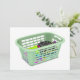 The humble laundry basket never looked as good as this design. It is a green laundry basket, the plastic kind with some nicely folded clothes in it. It actually makes a good household item design. This laundry basket design looks great on these invitations