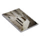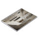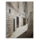Notebook with a photo with laundry consisting of white blankets hanging to dry in the sun on the facade of a white stone house in an alley with sandstone stairs in a town in Italy, creating a typical Italian/mediterranean street view.