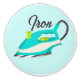 A cute, teal and lime green, laundry iron with pale teal background. "Iron" text at top.