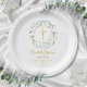 A decorative laurel garland, gold rings and crucifix sit above your special baptism or christening paper plate information on this elegant gender-neutral design. Designed by Thisisnotme©