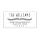 Return address rubber stamp featuring your surname/family name in a whimsical style font and the address below beneath a separating laurel leaf divider.