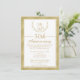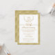 This 50th wedding anniversary invitation features a faux gold laurel wreath and border. The couples initials appear in the laurel wreath at the top of the invitation. The text area is white with a gold colour border and divider. The border on the front of the invitation and the back of the invitation features a faux gold background with a diamond like pattern. This 50th laurel wreath and faux gold invitation is ready to be personalised.