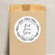 Custom-designed circular wedding favour labels/stickers featuring "Let Love Grow" encircled in a hand-drawn laurel wreath. Personalise with bride and groom/couple's names and wedding date. Perfect for adding a touch of style to garden themed wedding favour/gift packagings, envelopes, and more!