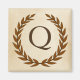 A delicate laurel wreath is layered over a parchment paper background in the classic Roman style. This design is personalized with the monogram "Q" in a rich sienna tone.