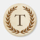 A delicate laurel wreath is layered over a parchment paper background in the classic Roman style. This design is personalized with the monogram "T" in a rich sienna tone.