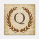 A delicate laurel wreath is layered over a vintage sheet music background in the classic Roman style. This design is personalized with the monogram "Q" in a rich sienna tone.
