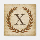A delicate laurel wreath is layered over a vintage sheet music background in the classic Roman style. This design is personalized with the monogram "X" in a rich sienna tone.