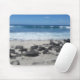 A captivating scene of ocean sea foam waves upon a sandy beach littered with lava rocks on a bright blue sky tropical day .Perfect for any beach themed decor or accessory.