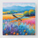 "Lavande Serenité". Wide Landscape Provence. In this peaceful stylised watercolour, the rolling hills of Provence are adorned with fields of lavender and mimosa. The bright meadow flowers add to the relaxed, tranquil charm of the scene, evoking a sense of timeless beauty.