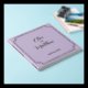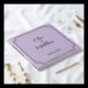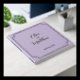 Wedding guest book in soft lilac tones with gold foil lettering written with script and serif fonts, with the couple names and wedding date inside a gold frame at the front and couple initials at the back