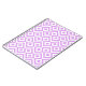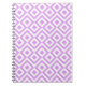 Spiral notebook features a decorative lavender and white geometric pattern. Lavender diamonds with white borders are surrounded by light purple meanders which angle around them. White zigzags separate the winding pale purple paths and offset diamonds.