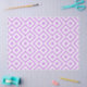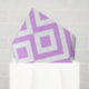 Stylish tissue paper features a lavender and white geometric pattern. Lavender diamonds with white borders are surrounded by light purple meanders which angle around them. White zigzags separate the winding pale purple paths and offset diamonds.