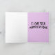 LAVENDER BIRTHDAY CARD. INSIDE READS: I LOVE YO!U! HAPPY BIRTHDAY!