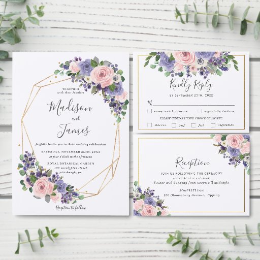 This elegant invitation features a beautiful pink blush, lavender watercolor floral arrangement, gold geometric frame and gold glitter details. Personalise it with your details easily and quickly, simply press the customise it button to further re-arrange and format the style and placement of the text. (c) The Happy Cat Studio