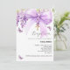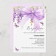 An elegant white background, decorated with a large lavender, purple coloured bow, wisteria flowers, butterflies and a golden cross. Personalise and add a name and party details.
