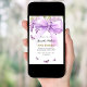 An elegant white background, decorated with a large lavender, purple coloured bow, wisteria flowers and butterflies. Personalise and add a name and party details.