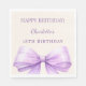 A soft ivory background color. Decorated with a large lavender colored bow. Personalize and add the name and date. Text: Happy Birthday!