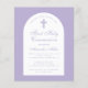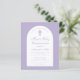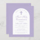A modern first communion invitation. On a lavender (light purple) background, it has a white arch with lavender text inside. The occasion and the name are written in an elegant calligraphic script; the first line is arched text.