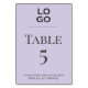 This custom corporate event or party table number card features a sample logo placed at the top which you can replace with your own custom business or company logo. The table number is printed in a large sophisticated font below the logo, followed by the company or host name printed at the bottom. The background is a lavender purple colour.