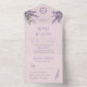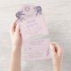 This elegant whimsical lavender wedding all-in-one invitation features beautiful hand-painted watercolor lavender flowers with grey text on a light pink background.