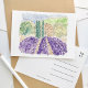 A beautifully painted watercolor travel postcard featuring lavender fields in Provence, France.