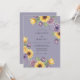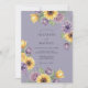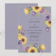 A soft lavender backdrop frames a whimsical cascade of yellow sunflowers, deep purple blooms, and pale yellow tulips. This design evokes a charming, painterly feel, perfect for a romantic countryside affair. The artwork blends rustic elements with a touch of elegance.