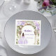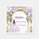 A large marble arch decorated with lavender colored florals. A girl with a lavender colored dress. Personalize and add a text, name, date.