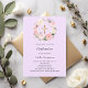 A lavender colored background, decorated with watercolored pink and white flowers in a wreath and a golden cross. Personalize and add a name and details.