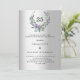 A faux silver looking background. A floral wreath made of lavender flowers and watercolored eucalyptus greenery. Personalise and add your names, details. Black text.