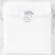 The sticker is made on wonderful paper and had no problem sticking to the bag that I purchased to put it on. I wanted to find a design that would be cute for the bride and groom and this one fit the bill as it has cute "bees" buzzing around and the wedding was taking place in a town called "Bee Cave". The packaging was great and protected the stickers. The website is easy to navigate and there are so many color choices. I had no problem finding a color that the bride was using on everything else selected. The design was adorable and there were many to choose from. You can make the figure as larger or smaller and you can place the photo and writting whereever you want to in the sticker. The printing is fabulous..better than expected.