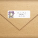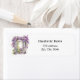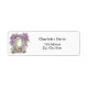 A white background. Decorated with a romantic country garden window covered with lavender coloured flowers, wisteria. Personalise and add your name and address. Black letters.