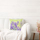 Throw pillow with image of lavender flowers against pale yellow background on the front and dandelions on the back with a lavender background.