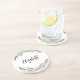 A paper coaster for a boho, french country style party. A chic white background decorated with lavender flowers and eucalyptus greenery. Personalise and add a name.