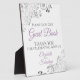 This elegant self standing sign or plaque will welcome guests to sign your wedding guest book. Fully customizable, and designed to coordinate with our Purple & Gray Elegant Wedding Suite, it features a simple sophisticated yet fancy design with lavender purple & gray text on a white background with a silver faux foil frilly floral filigree in the corners.