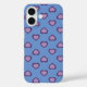 This iphone case features a repeating pattern of lavender hearts on a blue background.
