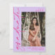 Girly pink and purple graduation invitation personalised with one photo on the cover and three more photo on the back. Double sided graduation invitation with a light purple background. 2 in 1 graduation announcement and invitation personalised with photos and the graduate's name in hot pink.