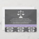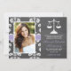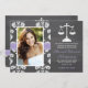 Add your photo or favourite picture to these rustic and pretty chalkboard style damask lace law school graduation announcements and invitations with a scales of justice in a chalk look artwork style and a printed LIGHT purple stitched ribbon look design. Customise it to say whatever you want on the back and front of the lawyer graduate graduation announcement and invite. Artwork © Chrissy H. Studios, LLC. All rights Reserved.