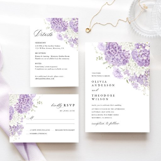 Complete your wedding stationery suite with matching table numbers, place cards, seating charts, welcome signs, and coordinated reception signage in the same lavender hydrangea floral style.