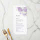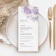 Lavender and white floral wedding menu card featuring soft watercolor hydrangea and lilac blooms.