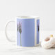 A simple and pretty lavender mug with lavender flower heads against the blue sky repeated 3 times around the mug.