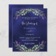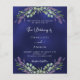 A navy blue background decorated with lavender flowers and eucalyptus greenery. The blue colour is uneven. Personalise and your names and details.
