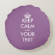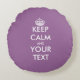 Cute lavender purple and white keep calm and your text round throw pillow. Personalizable template for making your own funny keep calm and carry on parody. Vintage keepcalm typography with little crown. Create your own keepcalmandcarryon spoof. Funny home decor for sofa couch or bed. Customise lilac colour / colour. Double sided design.