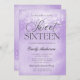 This modern lavender purple sweet 16 invitation features a trendy sparkle lights background and elegant script font. A glamourous invitation that you can edit yourself using the online template tools.