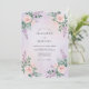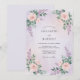 This design features a soft lavender watercolor background that creates a romantic atmosphere for a spring theme. Delicate peach roses and trailing purple lilac clusters are arranged elegantly alongside sage green foliage. The aesthetic is ethereal and airy, highlighting a beautiful botanical nature-inspired palette.
