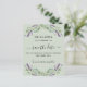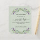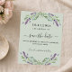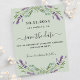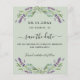 A modern and elegant Save the Date card for a wedding. A sage green background decorated with lavender flowers and eucalyptus greenery. Personalise and add a date and your names. The text: Save the Date is written with a large trendy hand lettered style script.