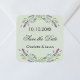 A Save the Date sticker for your wedding. A trendy sage green background decorated with lavender flowers and eucalyptus greenery. Personalise and add your names and wedding date.